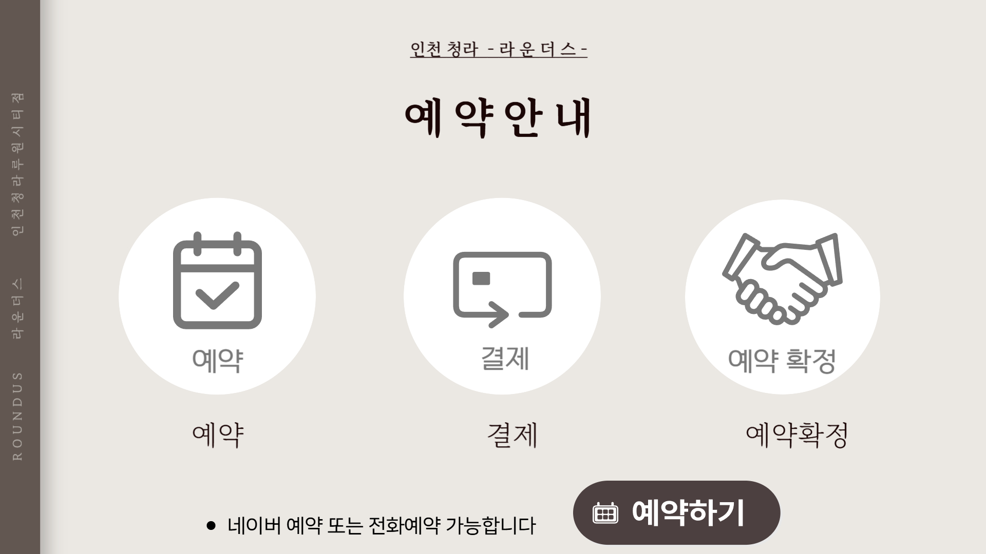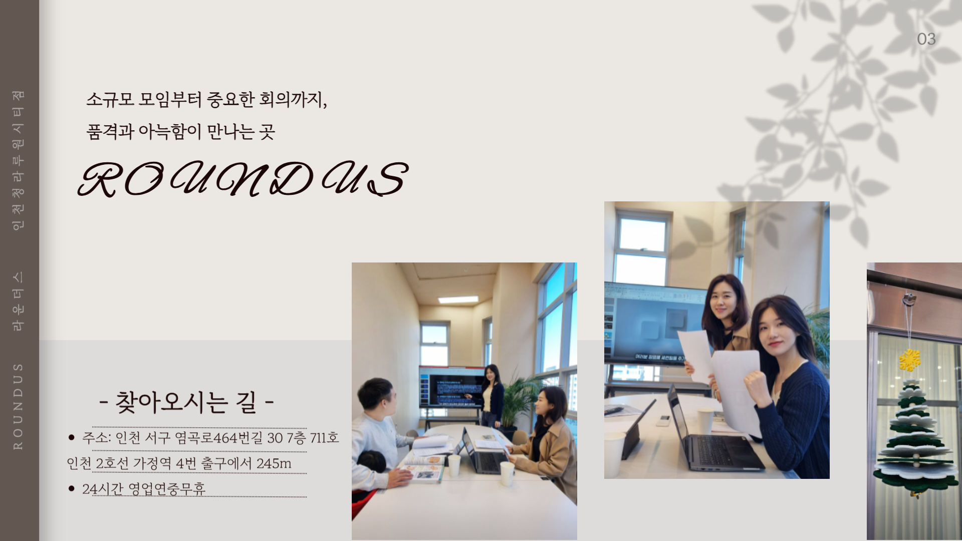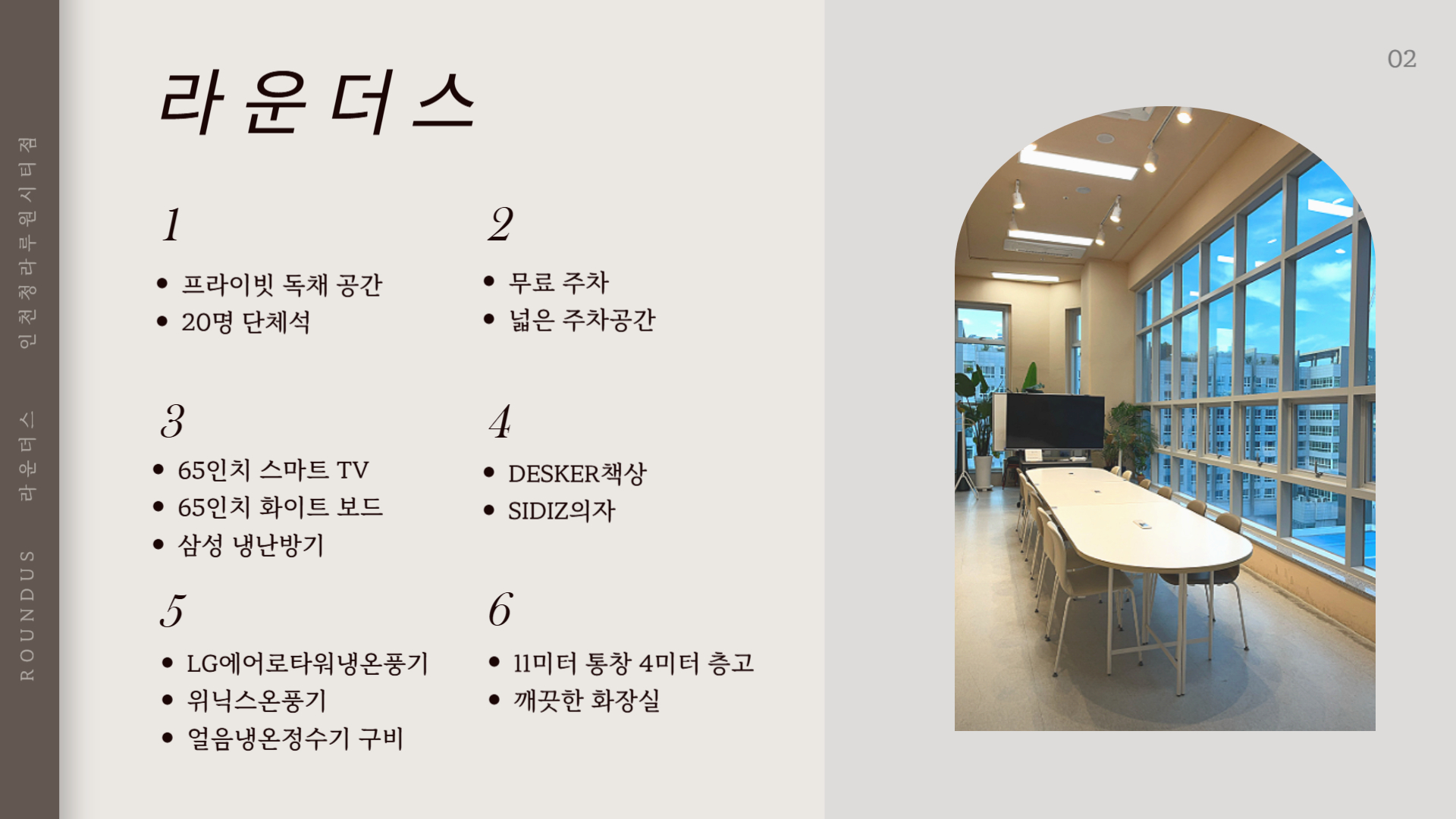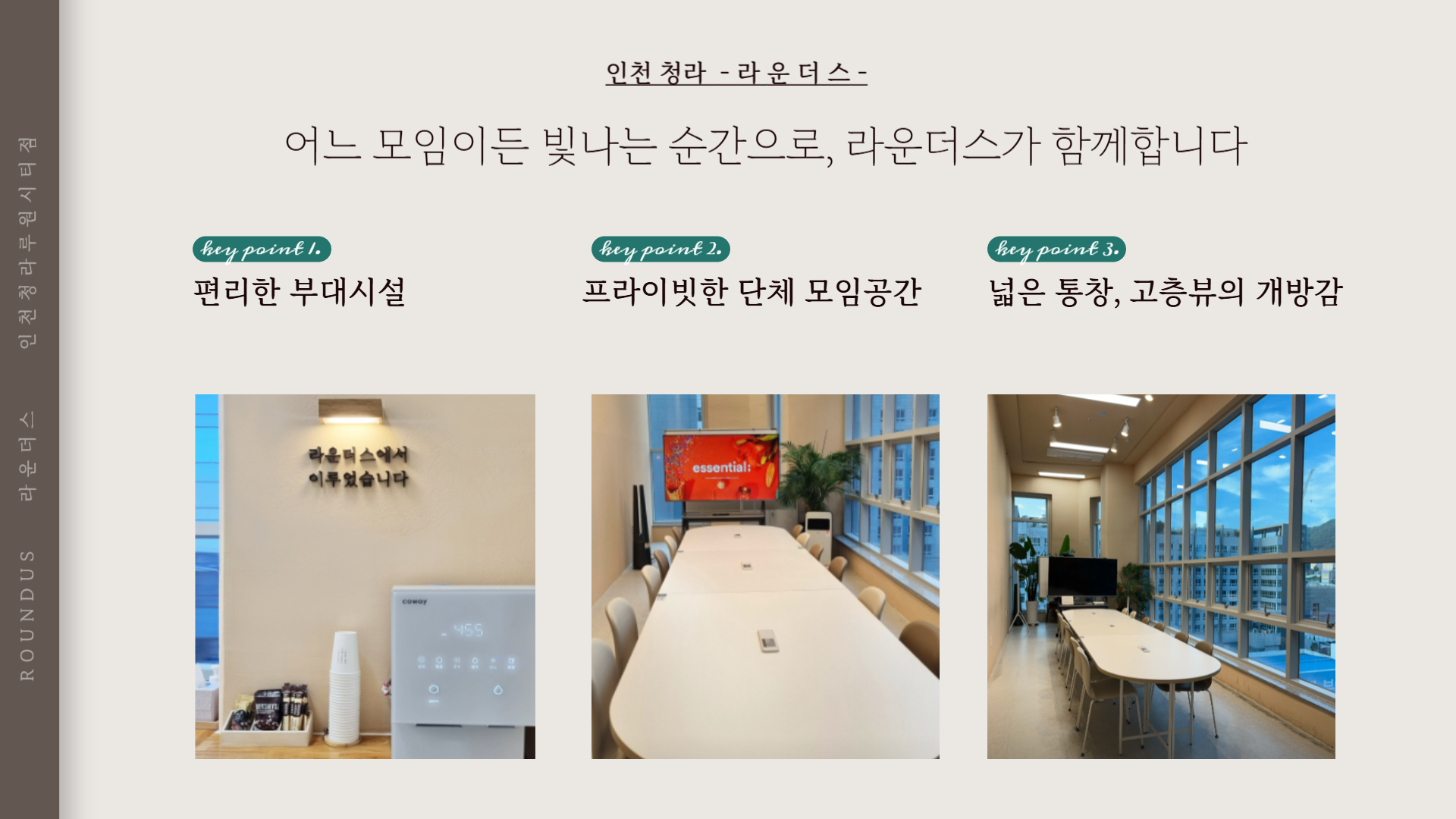 라운더스는 인천 루원시티에 위치한 프리미엄 모임 공간으로, 다양한 목적의 모임에 적합한 시설을 제공합니다. 회의, 세미나, 워크숍, 스터디, 면접 등 다양한 활동을 위한 최적의 환경을 갖추고 있습니다. 최대 20명까지 수용 가능하며, 독립된 공간에서 프라이버시를 보장받을 수 있습니다.